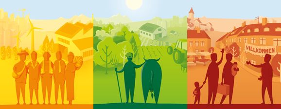 Plakat mit 3 Motiven nebeneinander in warmen Pastellfarben mit den Titeln