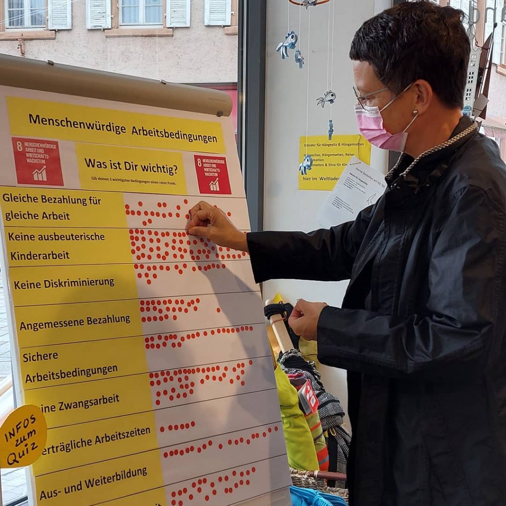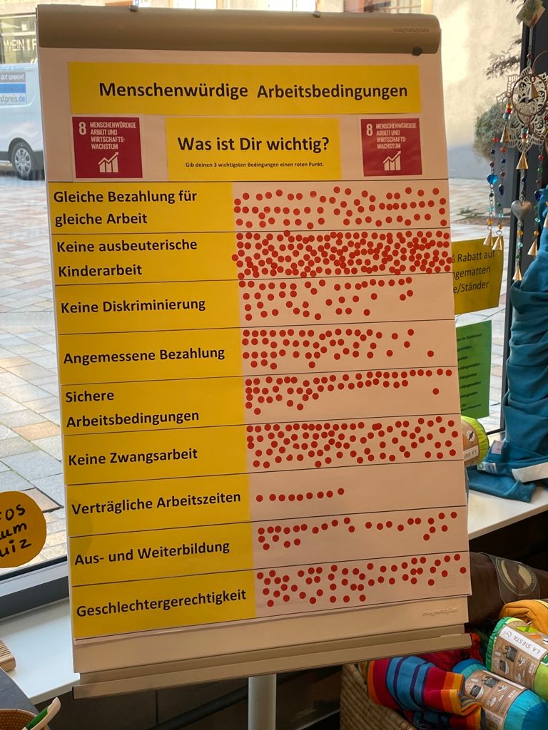 Im Weltladen hatten Kunden und Kundinnen die Gelegenheit an einem Quiz teilzunehmen. Ausserdem wurden sie aufgefordert auf einem Flipchart Punkte zu verteilen zum Thema: „Menschenwürdige Arbeitsbedingungen – Was ist mir wichtig?“ Vor allem diese Mitmachaktion wurde sehr gut angenommen.