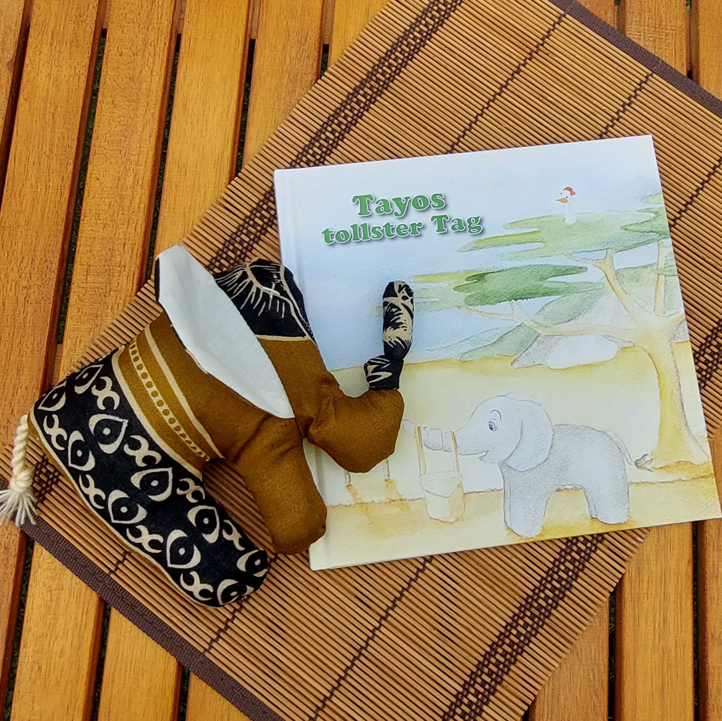 Zum Bilderbuch gehört auch ein kleiner Stoffelefant, genäht von der gehörlosen Paulina in Tansania, von wunderschönen afrikanischen Stoffen.