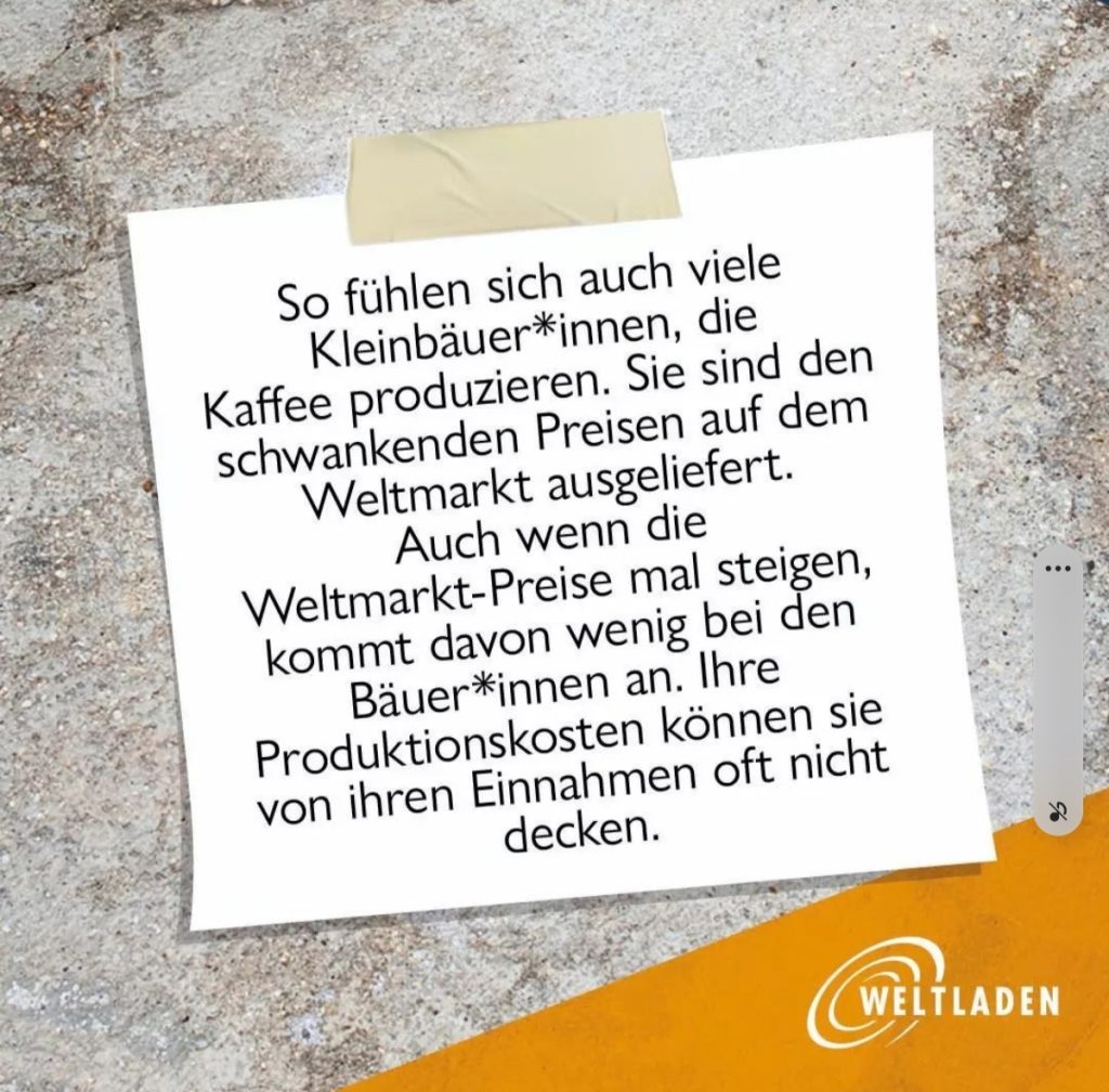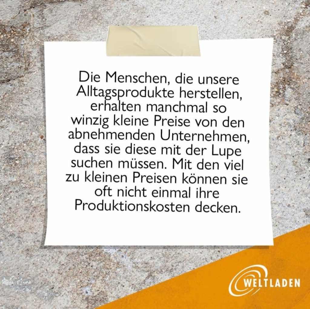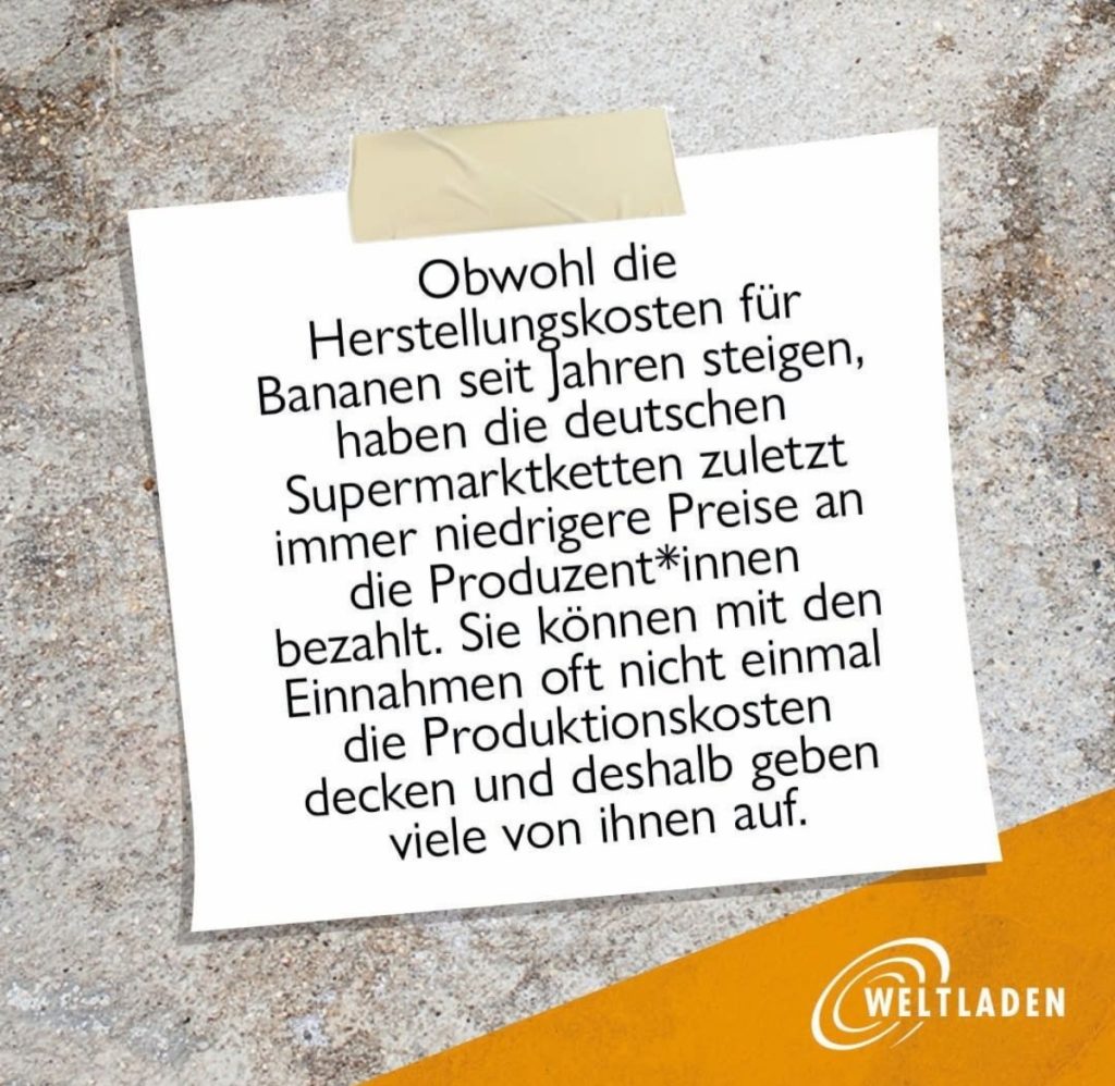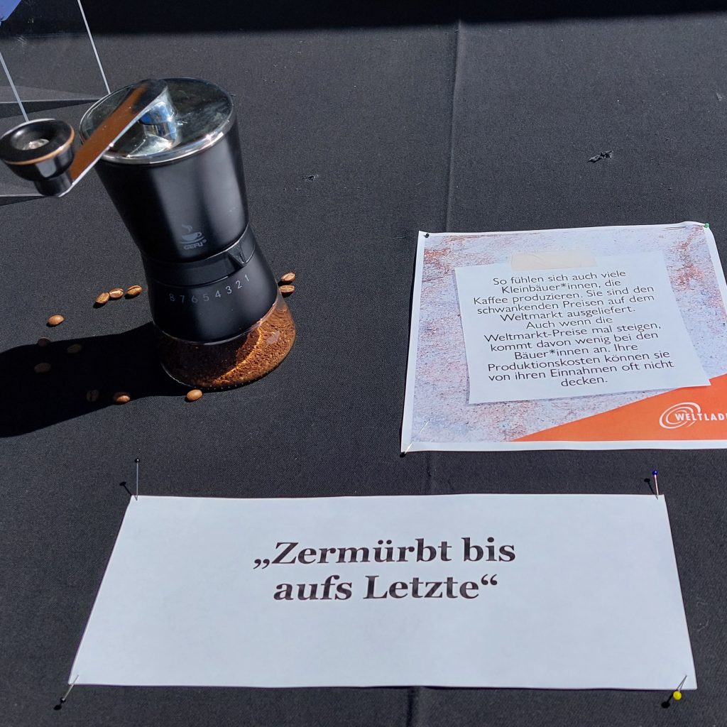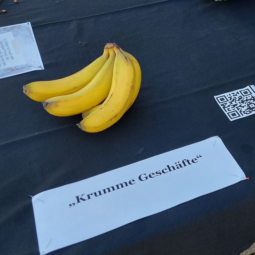 Warum sind eine Saftpresse, eine Lupe, Bananen und eine Kaffeemühle vor dem Weltladen Regentropfen in der Lange Straße 19 in Offenburg ausgestellt? Anhand dieser Alltagsgegenstände sollte unter dem Motto „MÄCHTIG unfair“ darauf aufmerksam gemacht werden, dass viele Produzent*innen weltweit kein existenzsicherndes Einkommen aus dem Handel mit ihren Produkten erzielen.