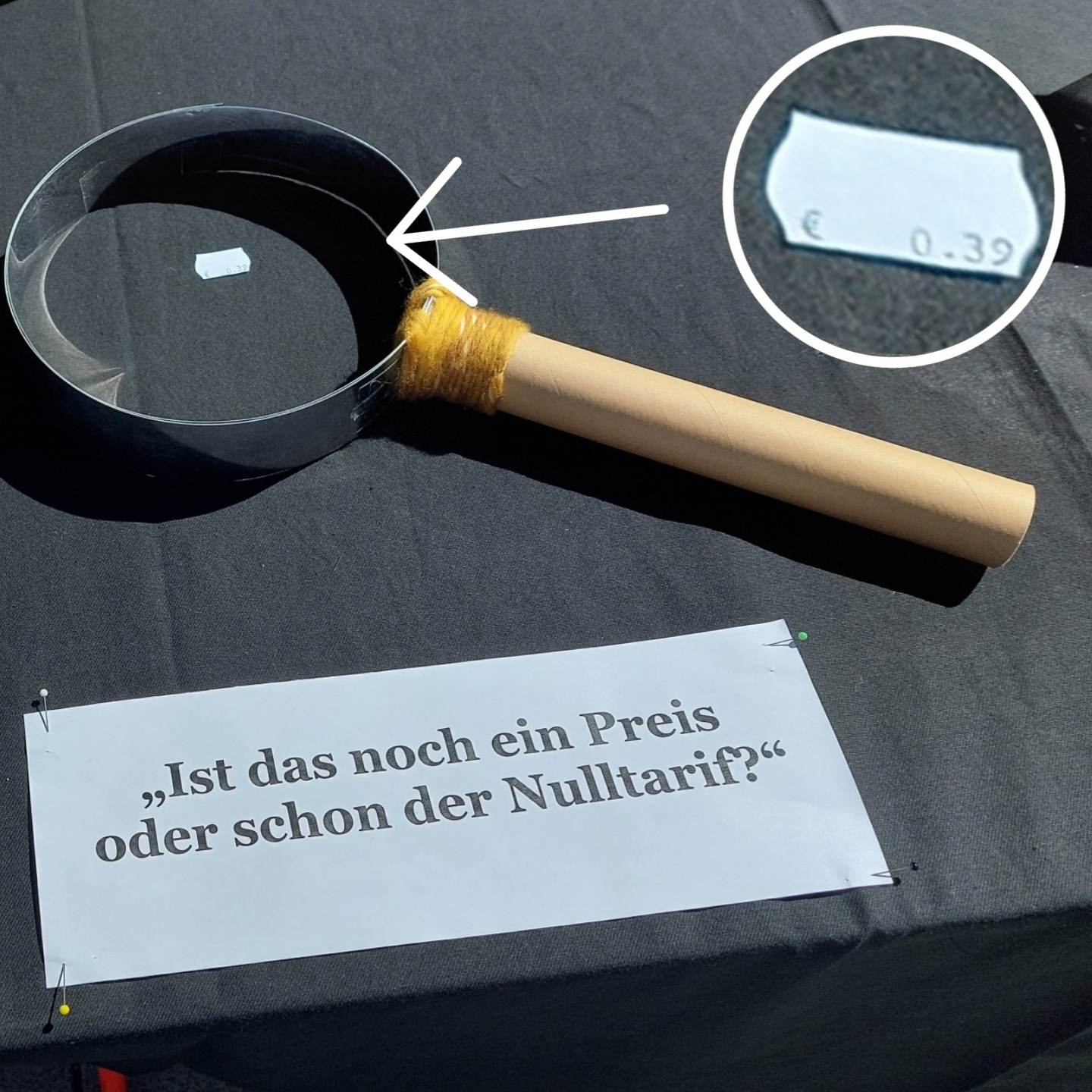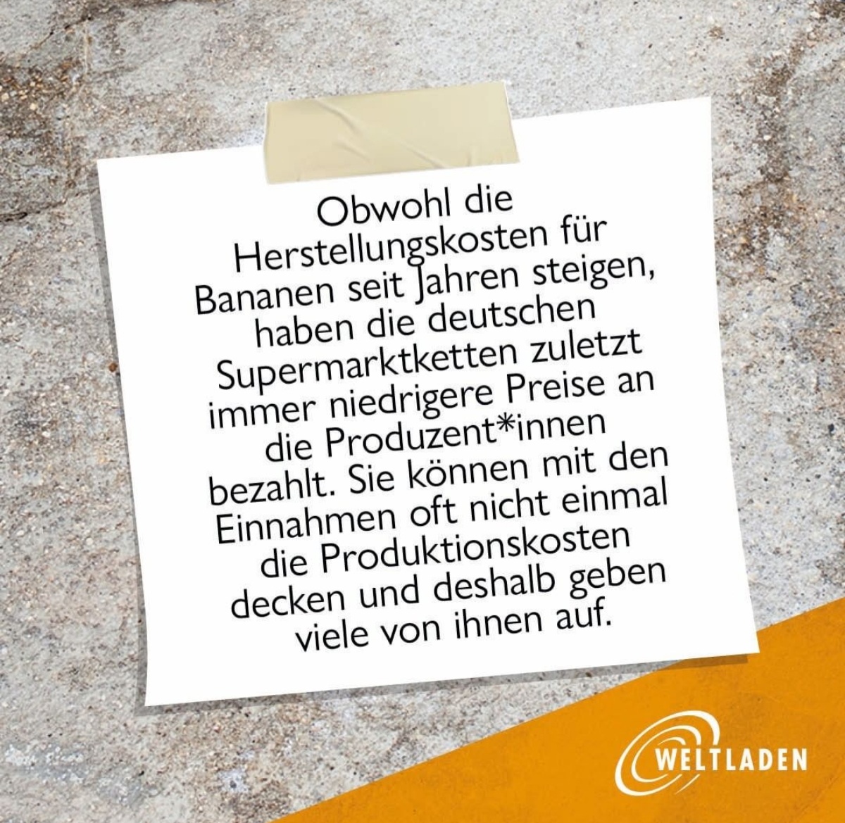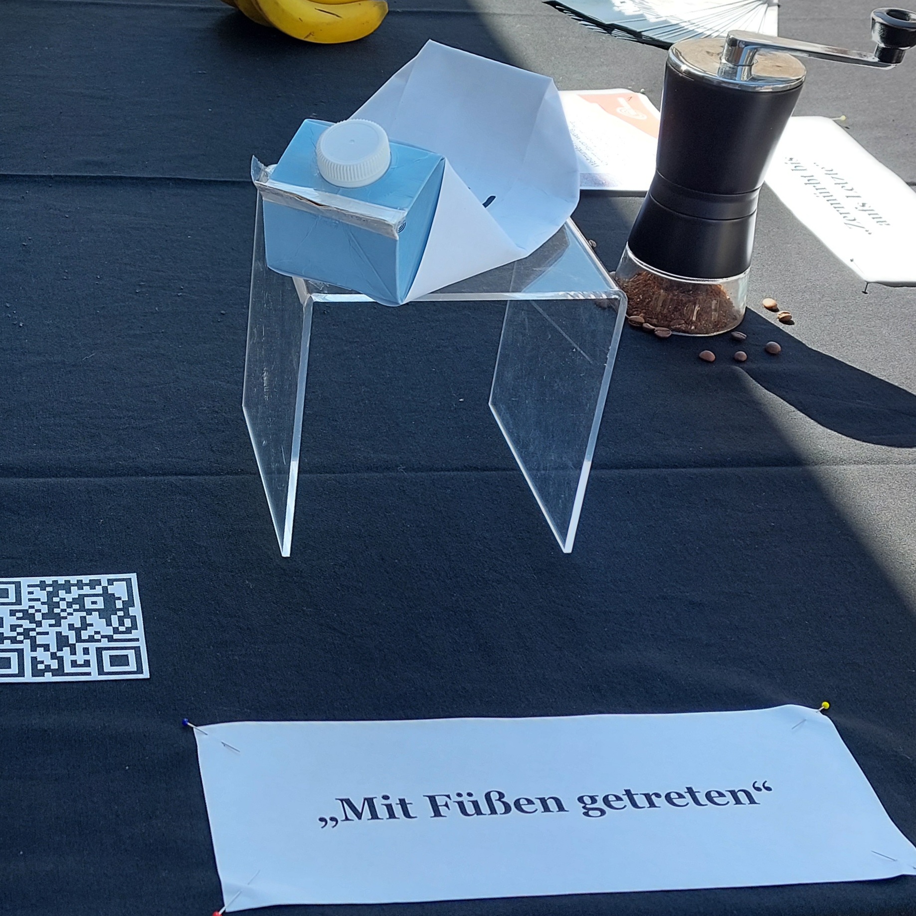 Warum sind eine Saftpresse, eine Lupe, Bananen und eine Kaffeemühle vor dem Weltladen Regentropfen in der Lange Straße 19 in Offenburg ausgestellt? Anhand dieser Alltagsgegenstände sollte unter dem Motto „MÄCHTIG unfair“ darauf aufmerksam gemacht werden, dass viele Produzent*innen weltweit kein existenzsicherndes Einkommen aus dem Handel mit ihren Produkten erzielen.